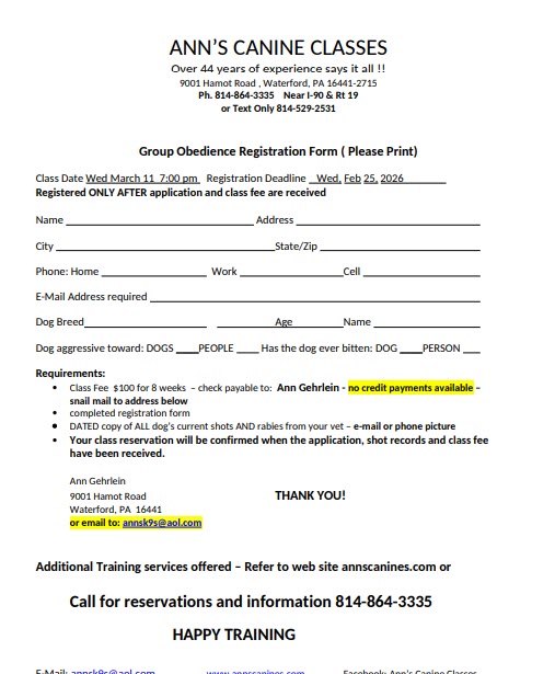 Please call me at 814-864-3335 or email me at annsk9s@aol.com to confirm your reservation for any class